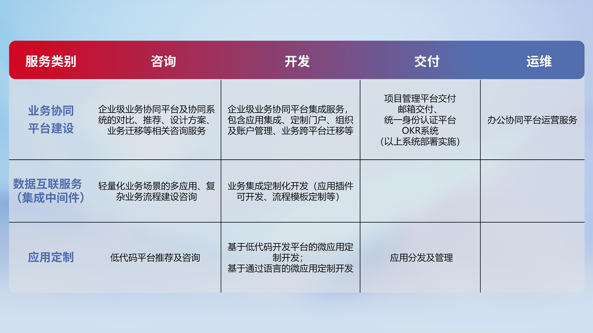 针对钉钉、、、、企微、、、IDaas等平台级产品提供产品的规划、、、方案、、交付、、定制化开发等服务,,,,实现如统一协同办公、、、、智能客户服务、、、、混合会议管理、、、智能数据查询、、、等业务场景,,,,实现数字化转型。。。